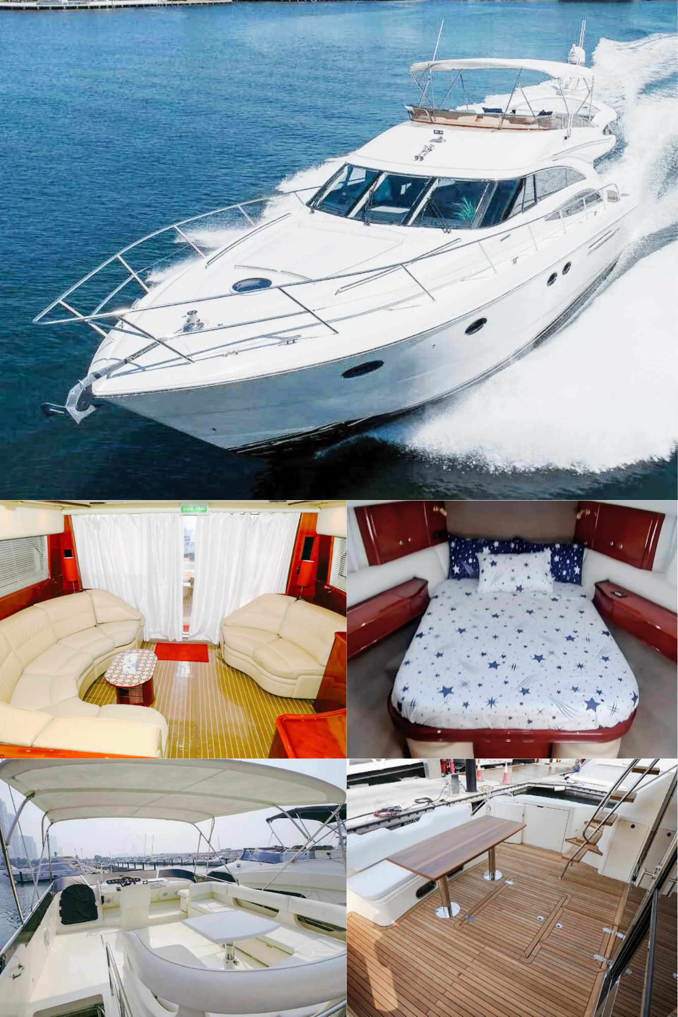 Our company is pleased to offer you the Top brand Princess 60 Feet Luxury Air-conditioned double deck Yacht good for 20 Guest Capacity with a 3 bedrooms Spacious lounge, 2 washrooms, kitchen, satellite television with a music system as well. Our price is Aed 599 per Hour only. Our offer includes water, soft drinks and ice along with music system and a Fully Air-conditioned yacht and you are allowed to bring your own food and drinks in the yacht also.